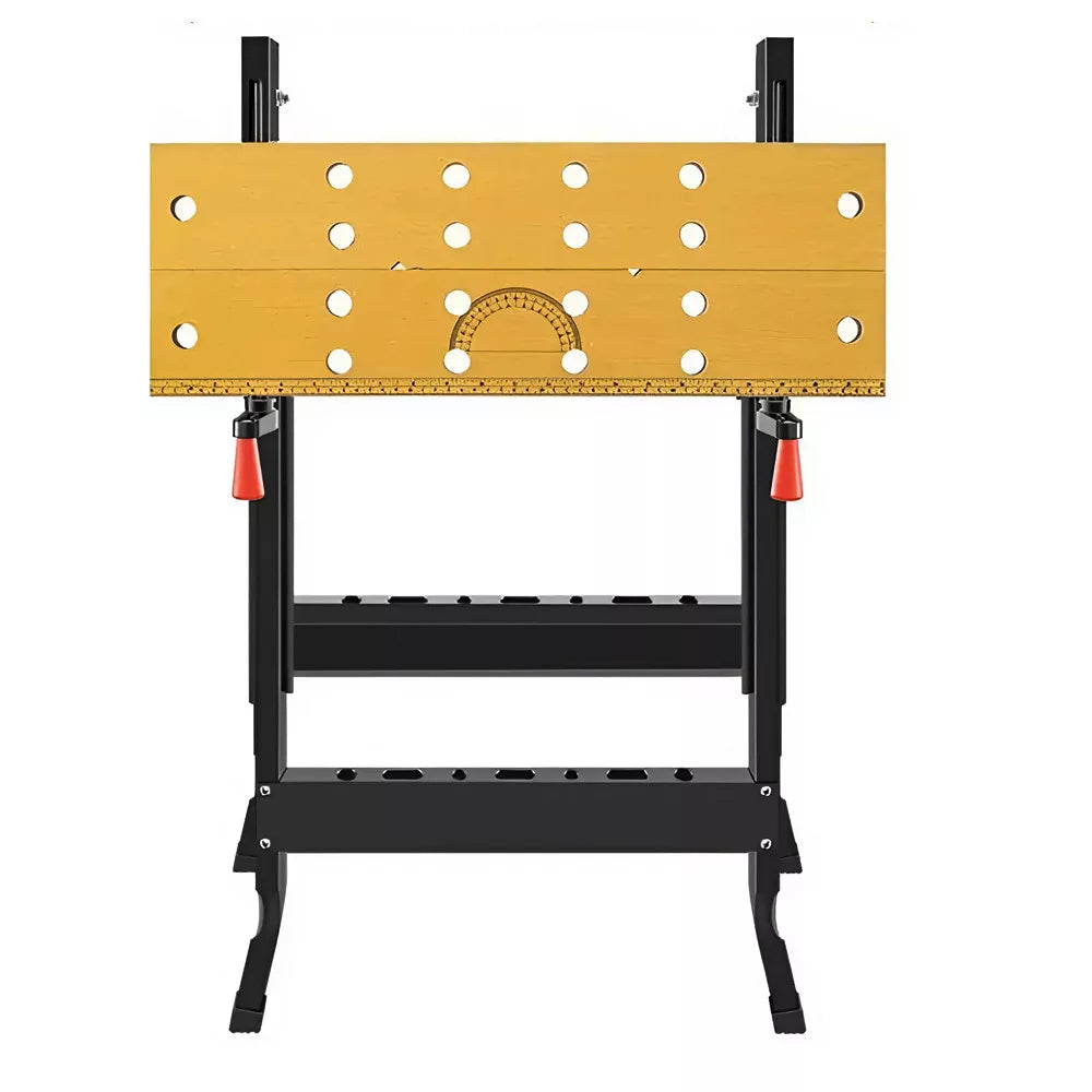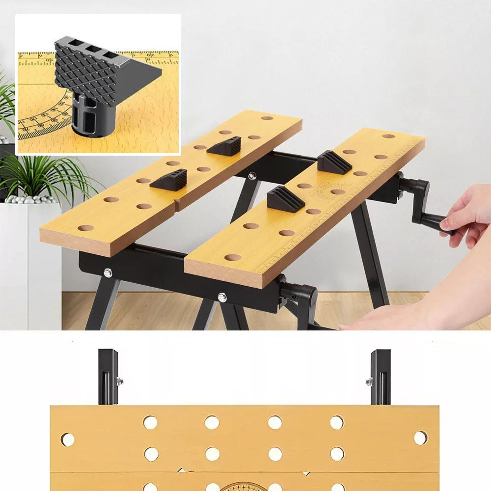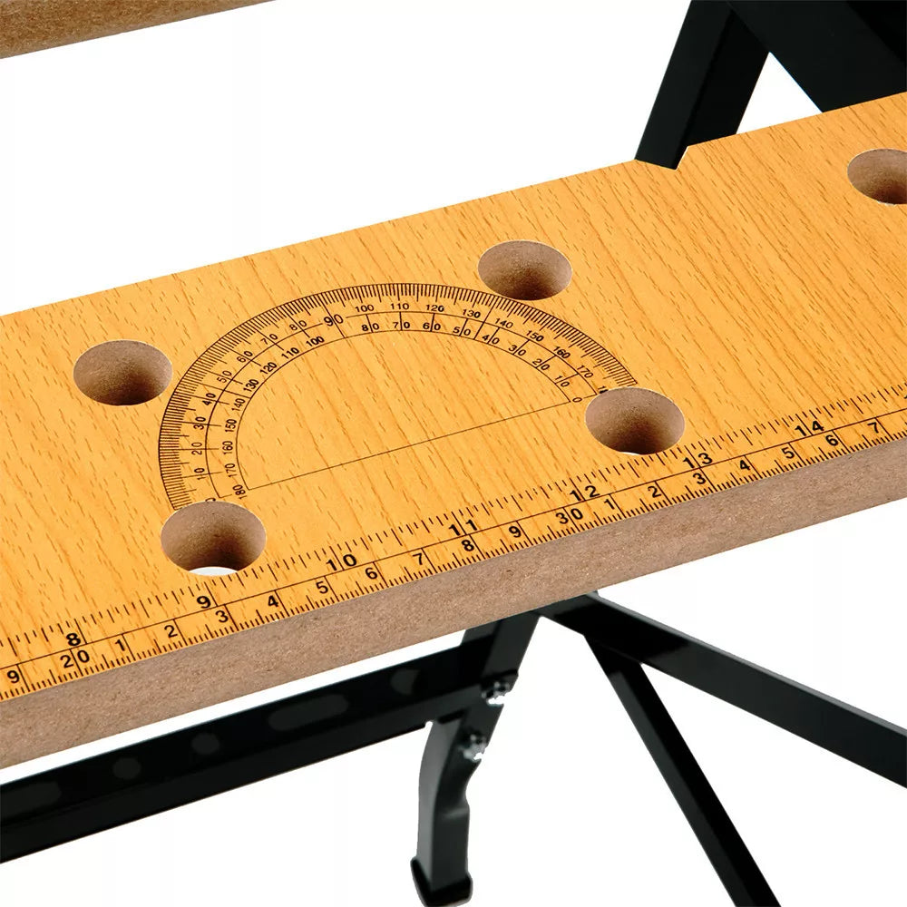 Az asztallap két része közötti távolság tekerőgombbal állítható, így könnyedén rögzíthetsz különféle méretű munkadarabokat. A beépített szögmérő és vonalzó segíti a pontos beállítást, legyen szó fűrészelésről, ragasztásról vagy összeszerelésről.Praktikus és helytakarékos kialakítás