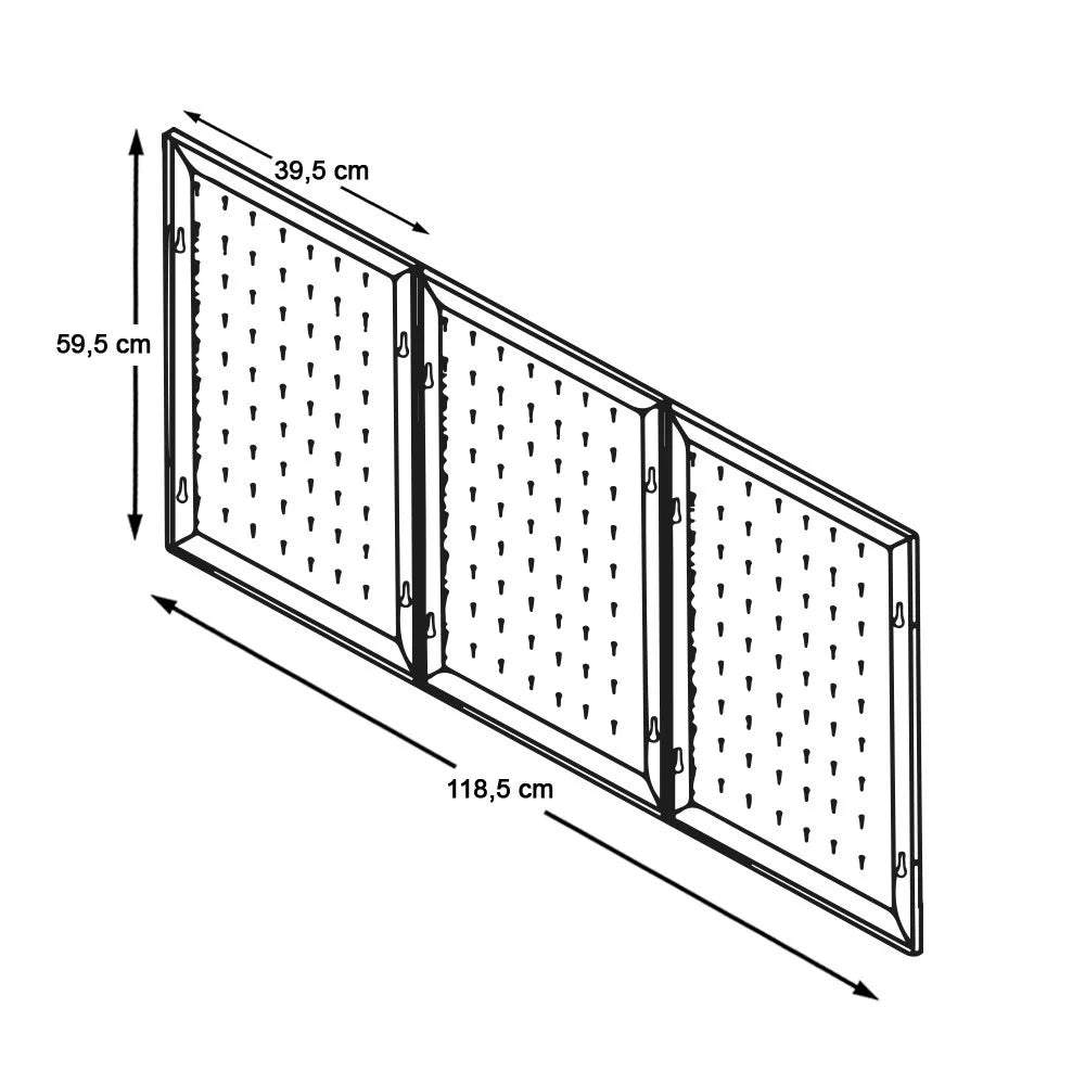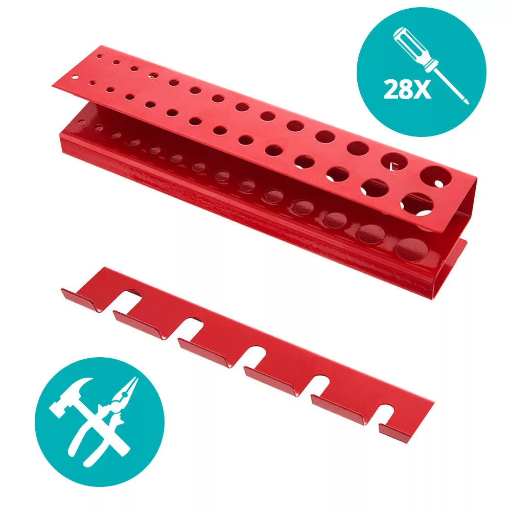 A szerszámos fal három részből áll, melyekre könnyedén, igényeidnek megfelelően felrakhatod a különböző méretű kampókat és rekeszeket, így alkalmas többek között csavarhúzók, fogók, fúrók, csavarkulcsok tárolására.