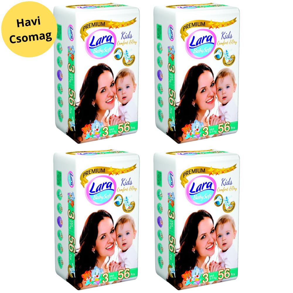 A LARA PELENKA MIDI 3 az 5–9 kg közötti babák számára ideális választás, akik már egyre aktívabbak, de még szükségük van a puha és biztonságos védelemre. A csomag 224 db pelenkát tartalmaz