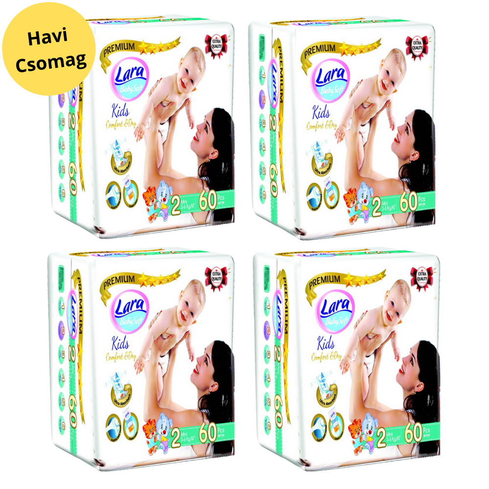 A LARA PELENKA Mini 2 az 3-7 kg közötti babák számára ideális választás, akik már egyre aktívabbak, de még szükségük van a puha és biztonságos védelemre. A csomag 240 db pelenkát tartalmaz