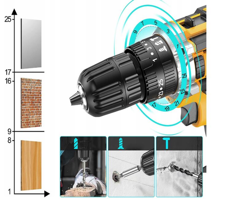 - Nagy nyomaték: Az 25 nyomaték pozíció lehetővé teszi, hogy a fúrógépet bármilyen anyagban hatékonyan használd, a fúrások pedig pontosak és simák lesznek.