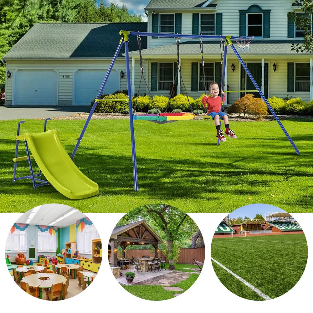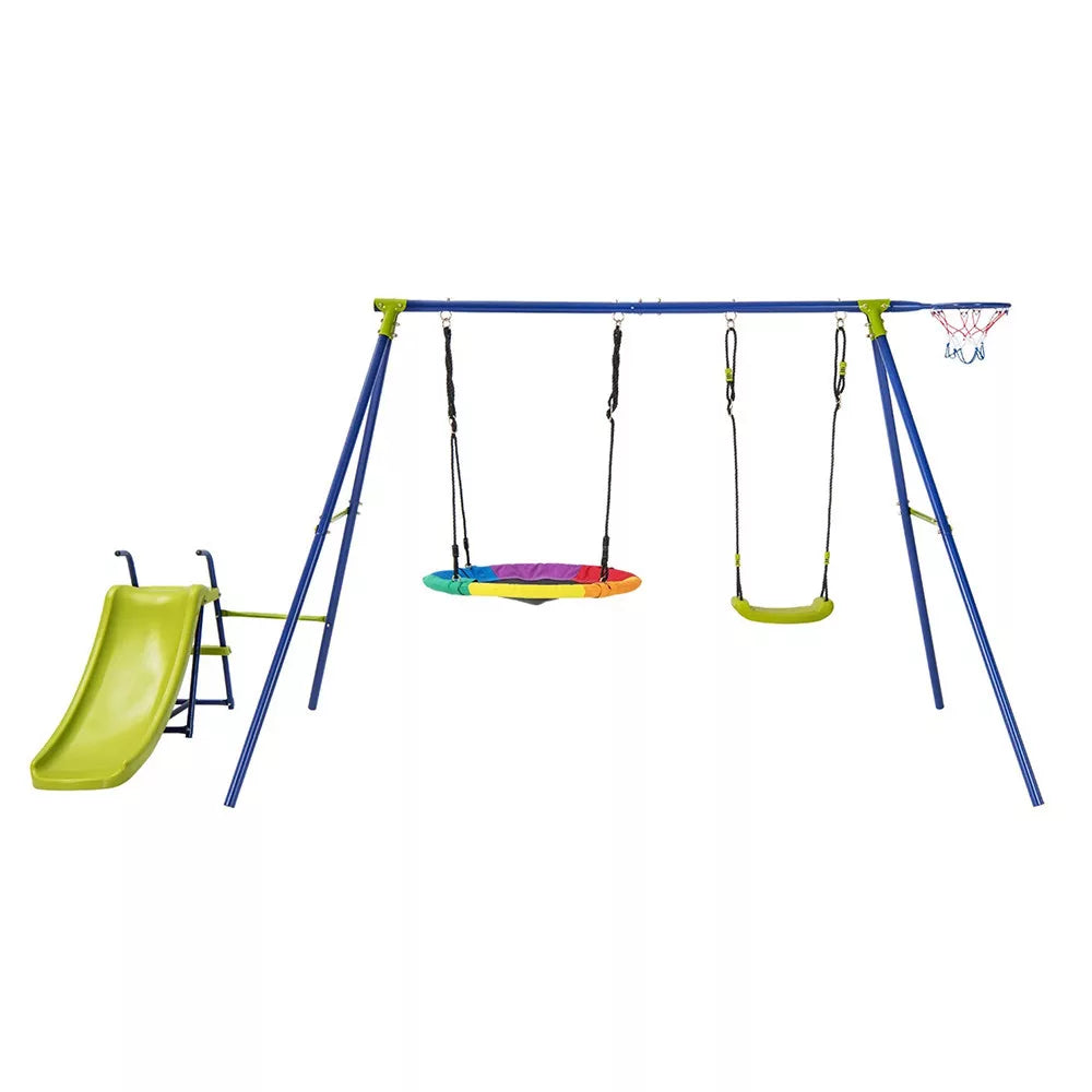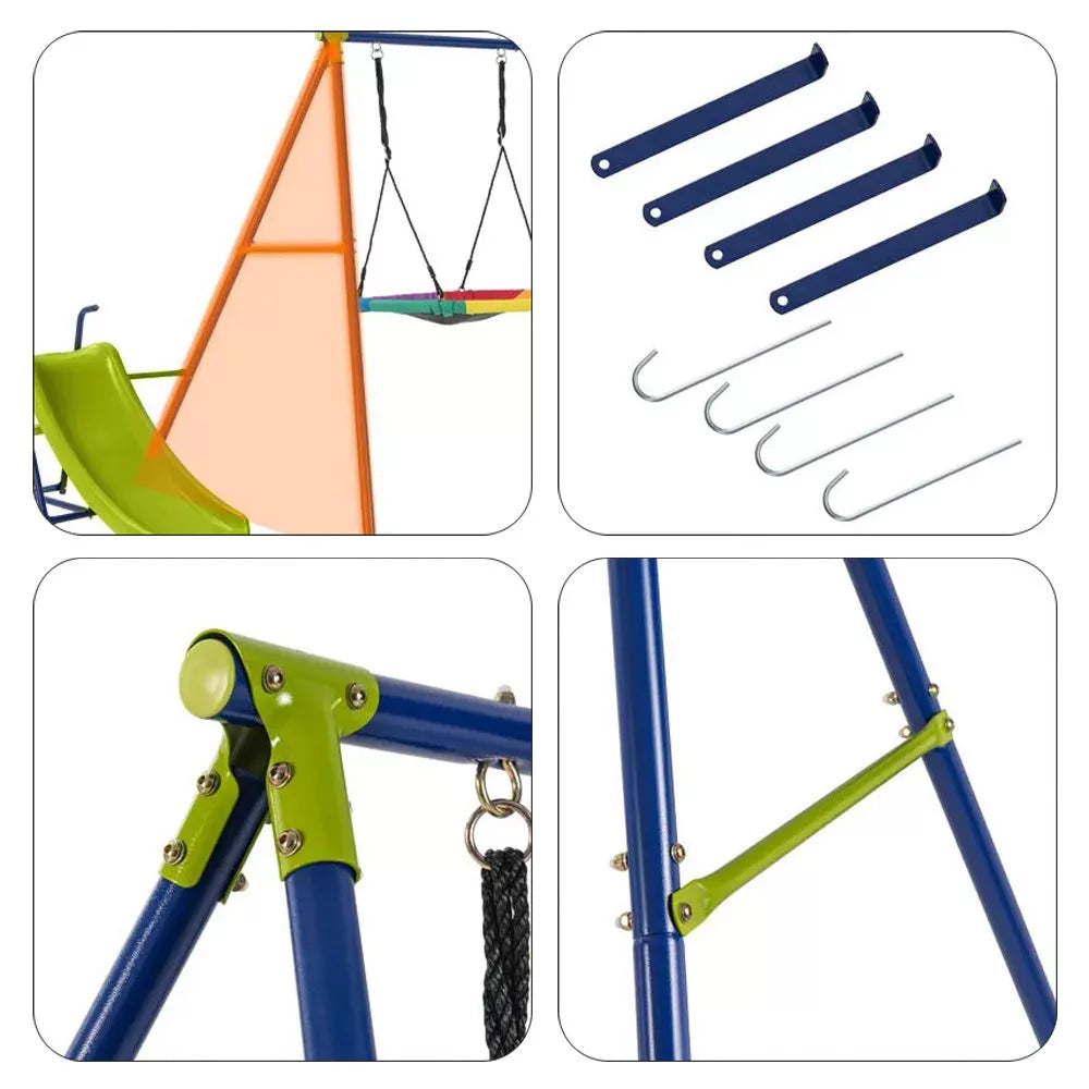 A porszórt fém A-váz ellenáll a rozsdának és a változó időjárásnak, a földhöz rögzíthető cövekkel pedig stabilan a helyén marad. A PE és Oxford szövetből készült ülőfelületek tartósan bírják a kültéri használatot.Mozgás és öröm egyben