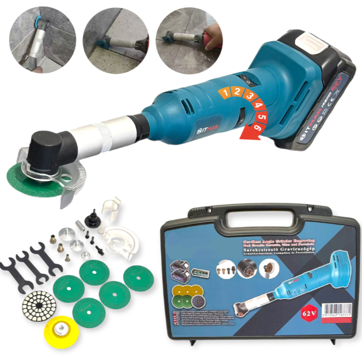 Professzionális, akkumulátoros sarokcsiszoló gravírozógép, amely kifejezetten gránitkerámiához, csempéhez és porcelánhoz készült. A nagy teljesítményű 62V-os rendszer, a két tartalék akkumulátor és a bőséges kiegészítőkészlet lehetővé teszi a gyors, pontos és mobil munkavégzést akár építkezéseken, felújításokon vagy műhelymunkáknál.