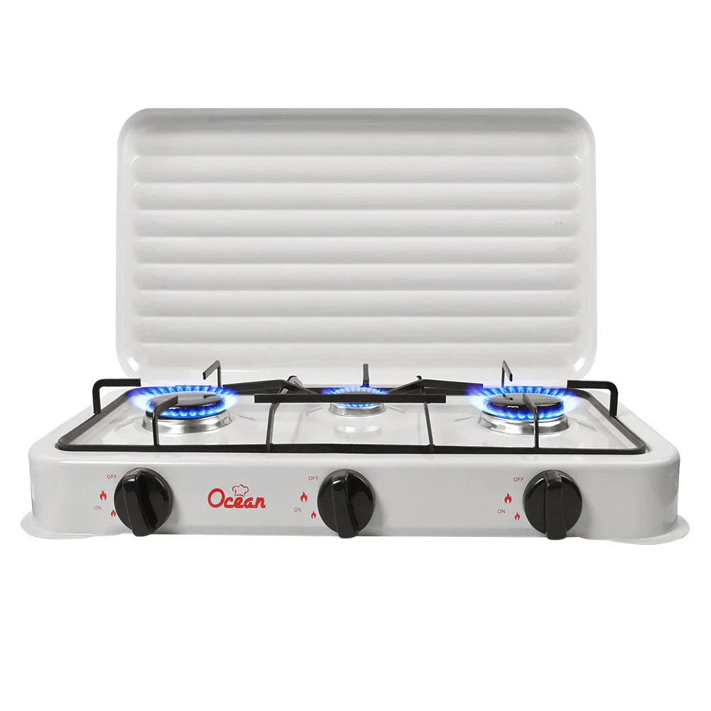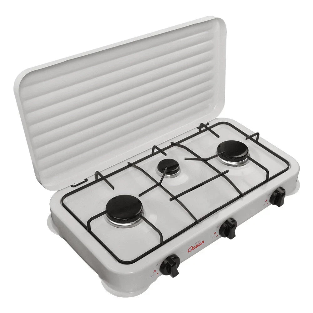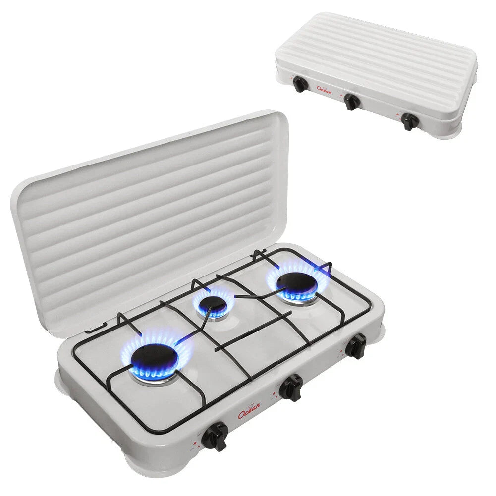 Hordozható gáztűzhely 3 égővel – kempingezéshez és otthoni használatra