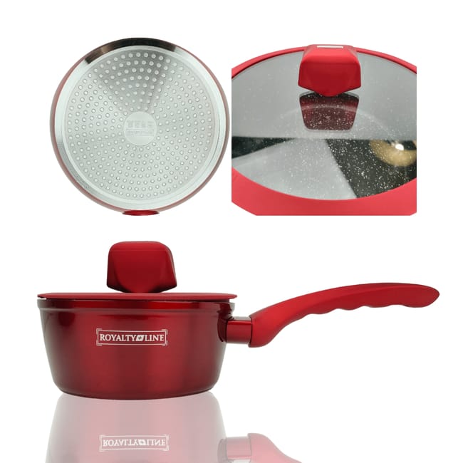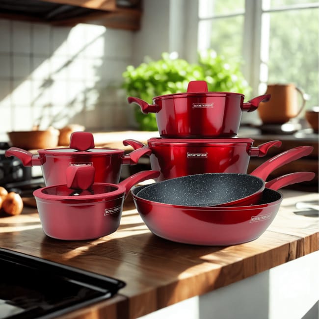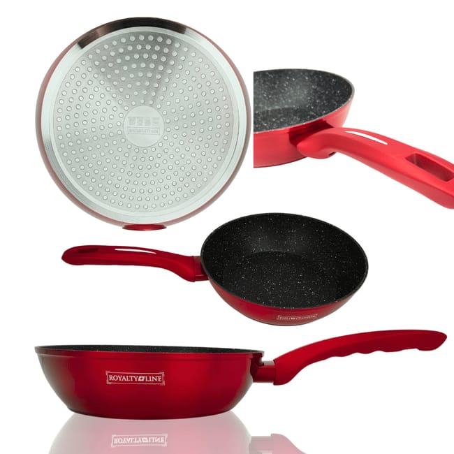 A Royalty Line indukciós edénykészlet 3 rétegű tapadásmentes réteggel rendelkezik, amely 100%-ban védi a káros anyagoktól. És nehéz és erős, hosszú távú használatra. A serpenyőkészlet hűvös tapintású ergonomikus és hőálló fogantyúkkal rendelkezik, amelyek kényelmes és biztonságos főzést biztosítanak.