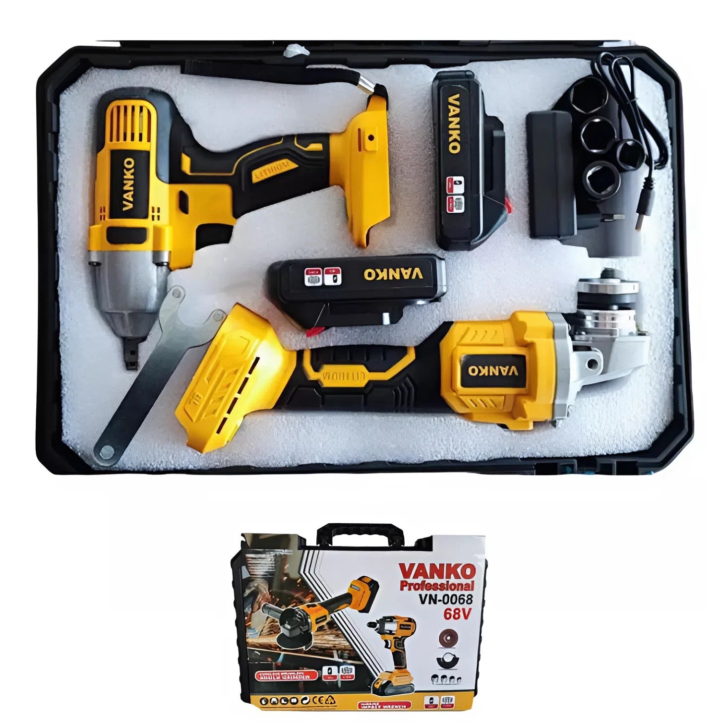 Vanko akkumulátoros kerékkulcs és sarokcsiszoló szett kofferben 68V VN-0068